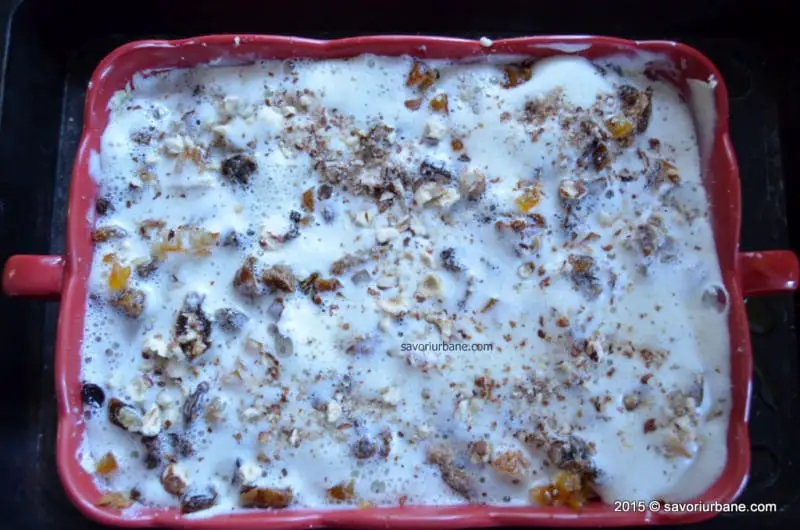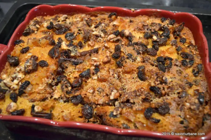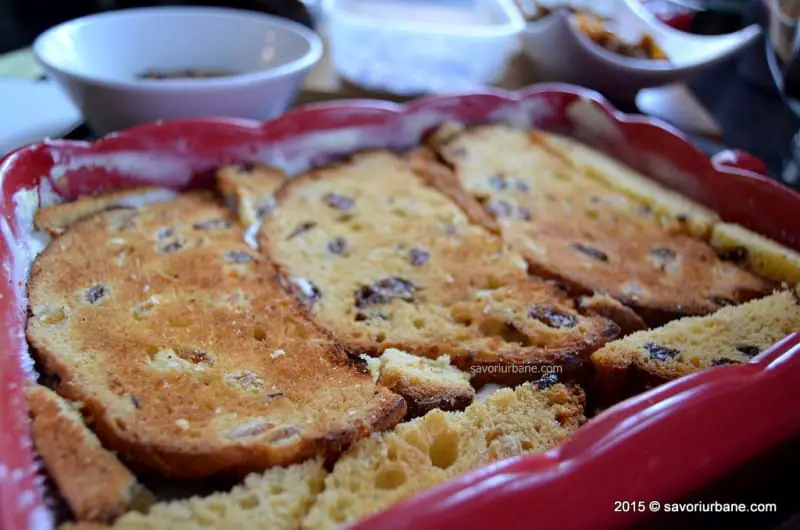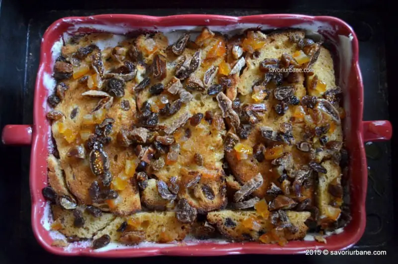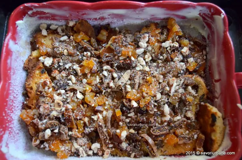Feliile uscate de cozonac se rehidrateaza cu o crema vanilata din lapte si oua, se presara din abundenta cu bucatele de fructe deshidratate sau confiate (coji de portocala, curmale, smochine, caise, stafide, prune, cirese etc), cateva alune de padure sau nuci si se coc sub forma unei budinci. Romul sau lichiorurile de portocale (Cointreau, Grand Marnier etc) fac minuni cu aceasta budinca!