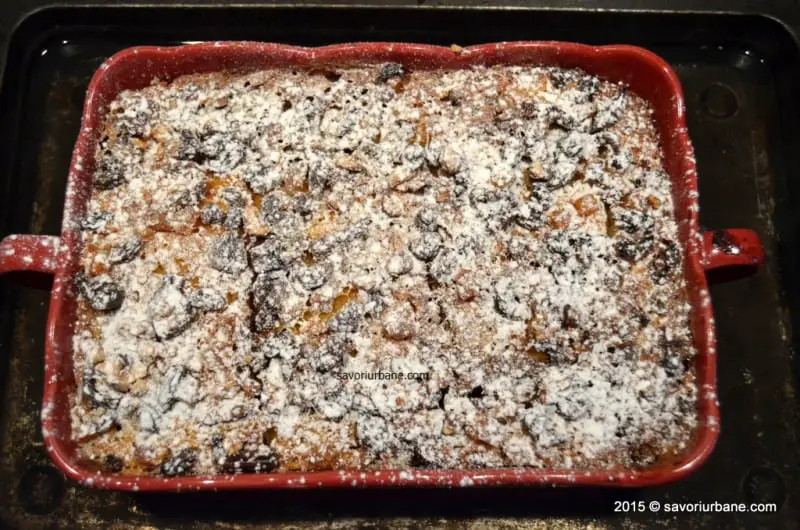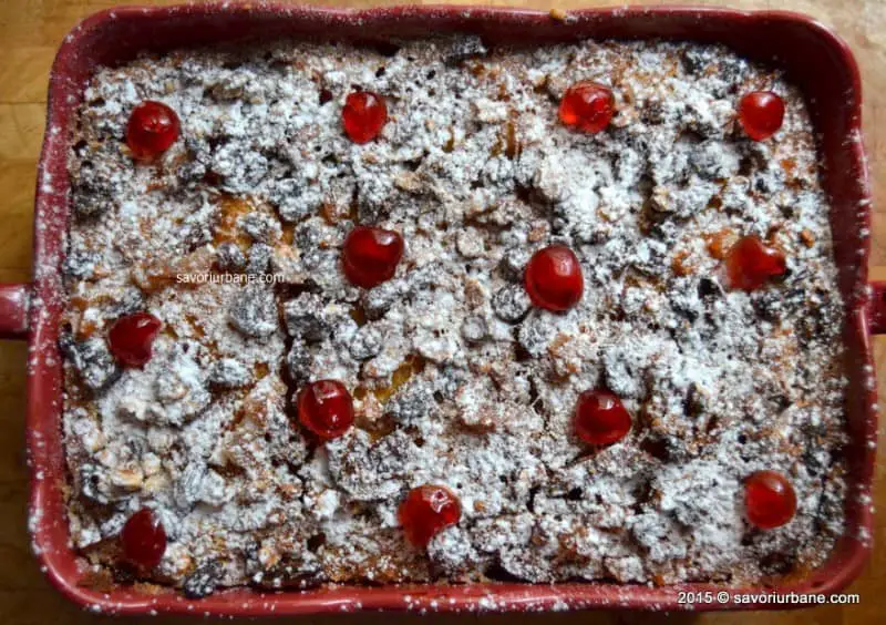 Dupa coacere am pudrat budinca de cozonac Diplomat din abundenta cu zahar pudra si am decorat-o cu cirese confiate. Ce arome!!