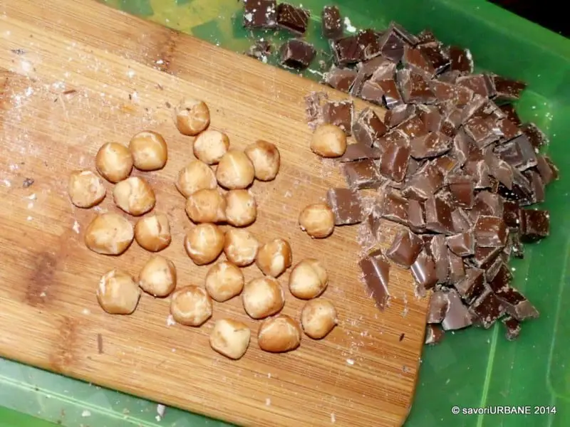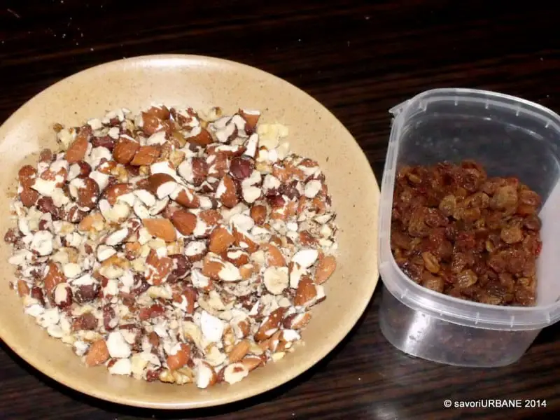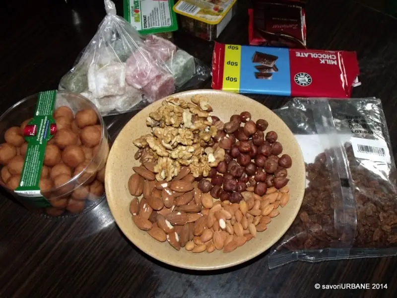 Se pregatesc fructele si nucile. In imagine apar si niste bilute din martipan (in cutia cilindrica). Le-am avut la indemana si le-am folosit si pe ele. Nucile, alunele, migdalele si samburii de caise se toaca din cutit, mai mare. Stafidele se inmoaie in rom. Rahatul se taie cubulete pe o planseta infainata sau presarata cu zahar pudra (ca sa nu se lipeasca unele de altele).