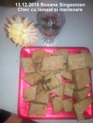 Acest chec cu lamaie si merisoare se coace 30 de minute in cuptorul preincins la 180° C si apoi inca 15 de minute la 170°. Se face proba cu scobitoarea. Daca scobitoarea este uscata, checul este facut.