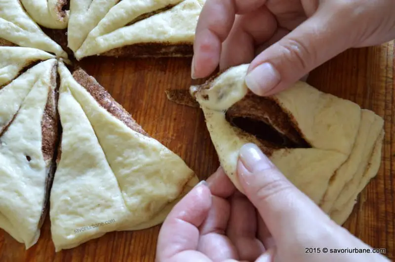 Se scoate aluatul din vas pe o scandura unsa cu ulei si se imparte in 5 parti, din care o parte va fi un pic mai mica. Intr-un castron se amesteca zaharul cu scortisoara – pentru umplutura.