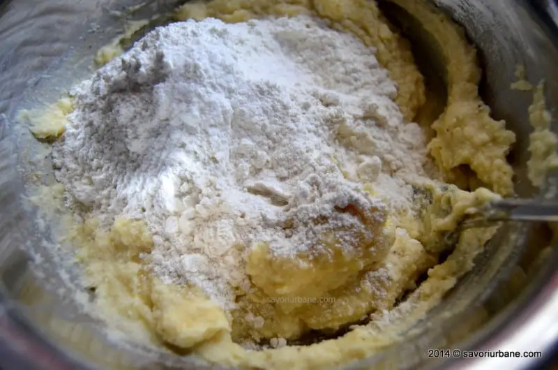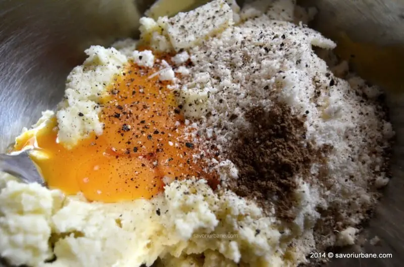 Intr-un castron am asezat piureul de cartofi din ziua anterioara, galbenusurile, parmezanul, untul moale, sarea, chimenul macinat, putina nucsoara si am amestecat bine. Am adaugat faina peste pasta cremoasa din castron si am framantat un aluat moale. Daca folositi cartofi fierti in coaja este bine ca acestia sa fie calzi si sa-i radeti pe razatoarea cu ochiuri mici.