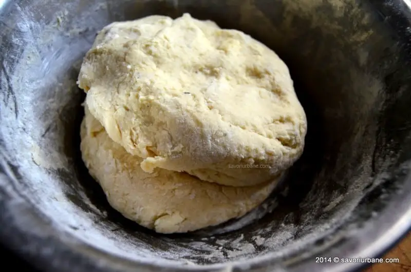 Am infainat bine blatul de lucru (este un aluat lipicios si nu trebuie adaugata faina in el ca sa devina prea vartos) si am impartit aluatul in 4.