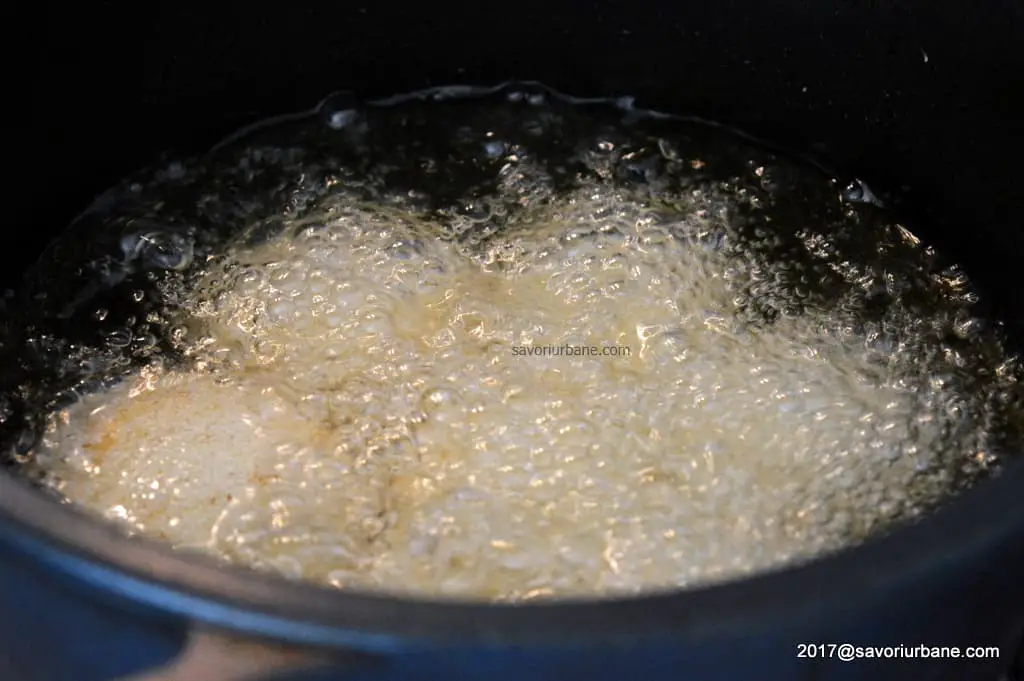 Intr-o tigaie sau o oala se incinge uleiul. Se lucreaza la foc mare. Se pun crochetele una cate una in baia de ulei (aceastea nu trebuie sa ajunga la fundul tigaii ci sa pluteasca in ulei) si se intorc si pe partea cealalta. Apoi se scot pe servetele absorbante. Crochetele raman complet neimbibate cu ulei, surplusul ramane pe servetele.