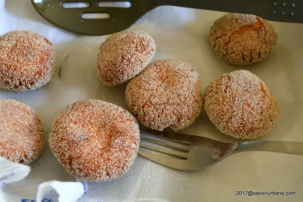 Cu mainile umede formam mici sfere (cu diametrul de 4-5 cm) si apoi le dam prin gris.