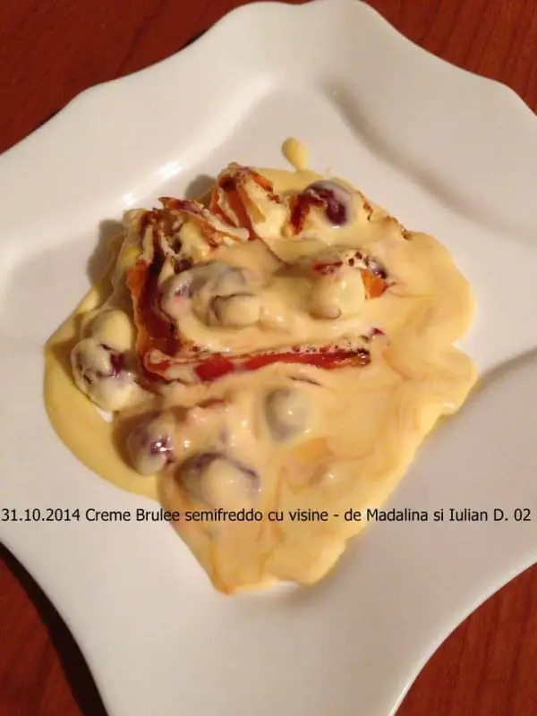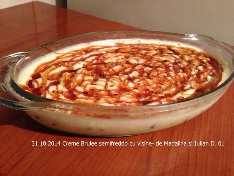 Inghetata de zahar ars cu fructe. Va prezint o un semifreddo creme brulee fara coacere. Gatita la abur, pe aragaz si apoi congelata. Crema caramel, de zahar ars care se face la noi nu este crème brûlée ci mai mult un flan cu caramel (vorbesc de cea rasturnata). La crème brûlée si consistenta este alta (are frisca lichida in ea) si are si caramel in forma de crusta crocanta – la suprafata.