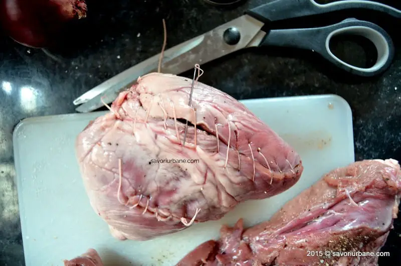Le-am condimentat bine (exterior si interior) cu sare si piper apoi le-am cusut cu ac si ata de bucatarie. Am incercat sa le redau forma initiala. Dr. Frankenstein :))