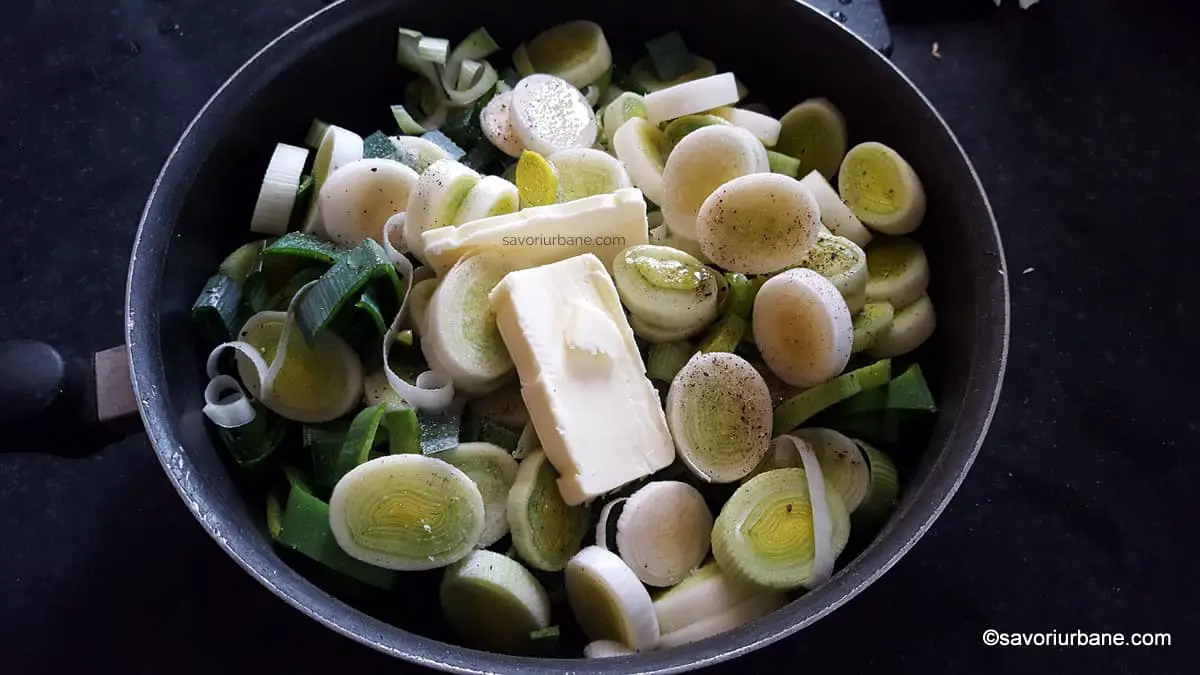 Am pus rondelele de praz într-o cratiță adâncă cu 75 g de unt, o lingură de ulei și un praf de sare. Nu exagerați cu sarea acum deoarece și brânza va fi sărată! Am călit prazul la foc mediu (sub capac) timp de 10-12 minute, amestecând ocazional în cratiță ca să nu se ardă.