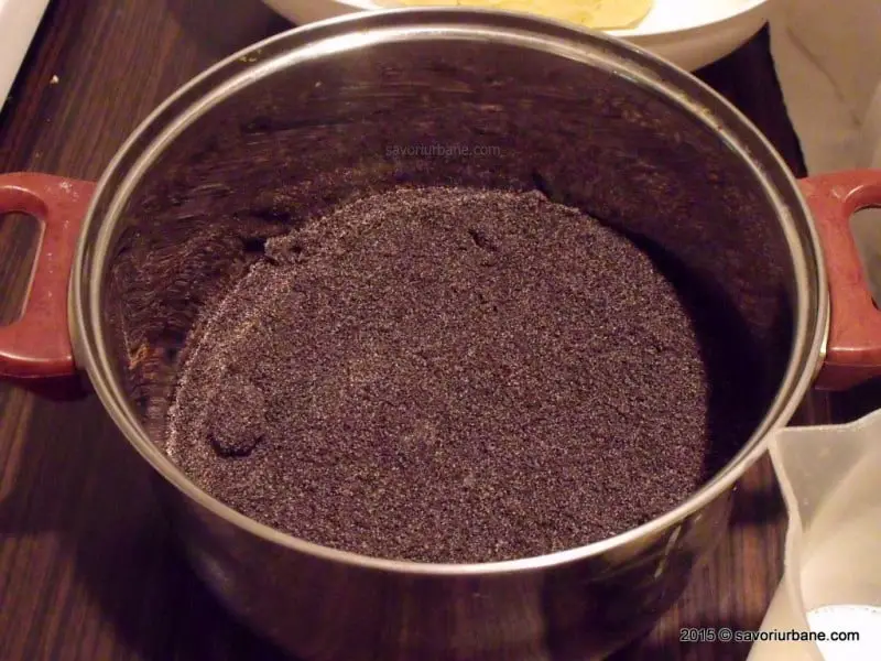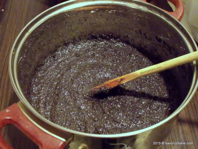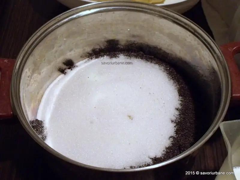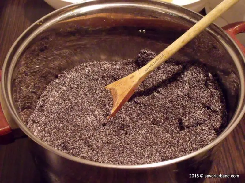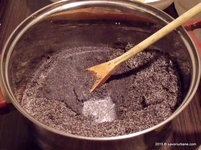 Pentru umplutura cu mac se macina macul si se amesteca cu zaharul, cu zaharul vanilat si coaja rasa de lamaie si apoi se dilueaza cu laptele. Se pune pe foc si se fierbe cateva minute.