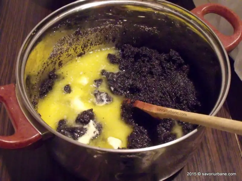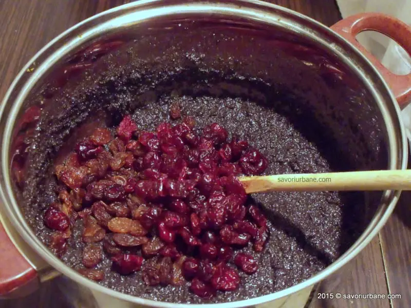 Se adauga untul topit si se amesteca bine, se mai lasa un clocot, apoi stafidele si merisoarele. Gata.