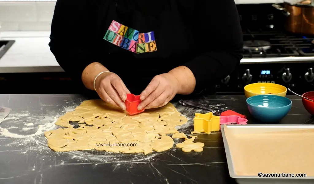 Decupare fursecuri fragede cu forme: inimioară, steluță, floricică și ornare cu albuș, nucă și zahăr granulat