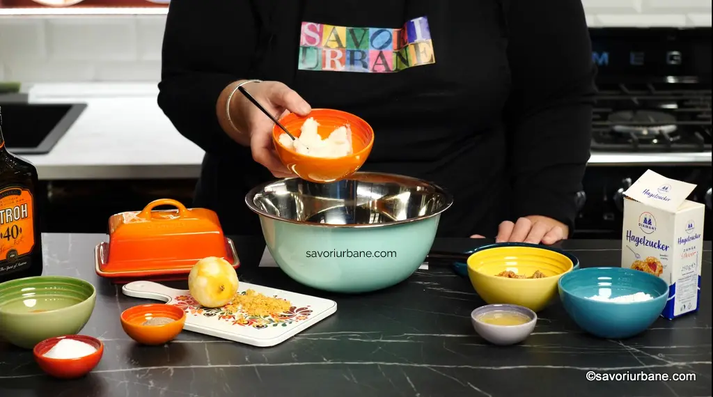 Am pregătit toate ingredientele menționate mai sus: făina, untura, untul, zahărul, sarea, ouăle, smântâna și aromele: vanilia și coaja rasă de lămâie. Romul (veritabil, nu esență!) poate fi substituit cu coniac, brandy sau lichior. Alcoolul din acestea are rol de agent de afânare și se evaporă în timpul coacerii fursecurilor.
