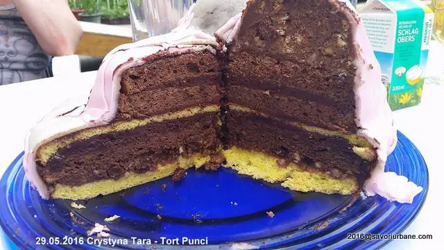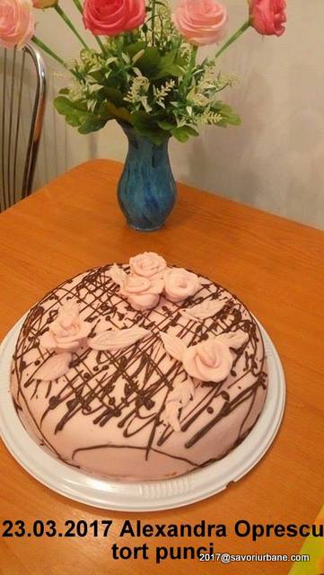 Tortul punci este gata! Se lasa la racoare (in camara) cateva ore ca sa aiba timp sa se intrepatrunda aromele si cremele. Se taie felii cu un cutit inmuiat in apa fierbinte. Este delicios!
