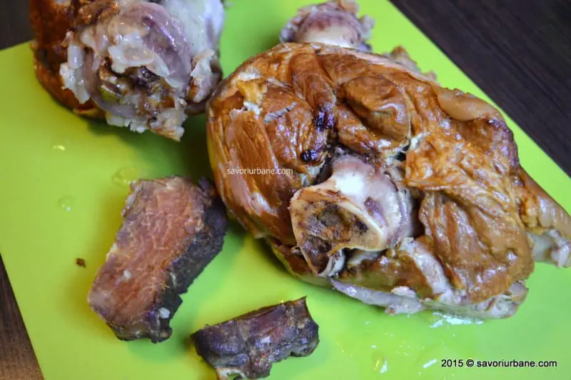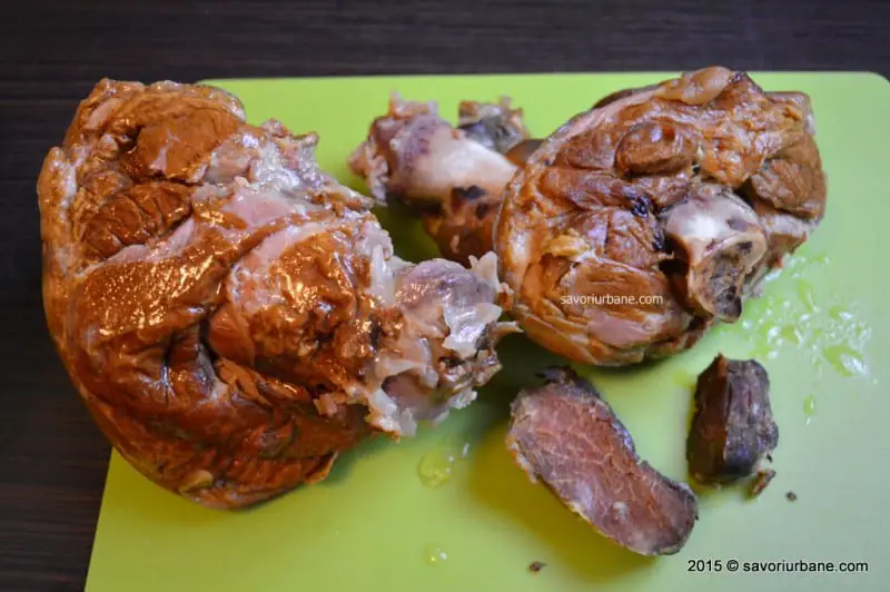 Inainte de toate fierbem ciolanul (si alte bucatele de sunca, ceafa afumata) cu piper si ceapa rosie, aproximativ 50 de minute. Se scot ciolanele din apa si se lasa la racit. Apa in care au fiert nu se arunca ci se lasa la racit pentru a scoate grasimea care se va aduna la suprafata ei. Cel mai bine se lasa peste noapte, la rece.