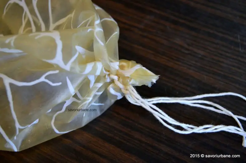Un mat de 30 cm se leaga la un capat cu cate 2 noduri si unul transversal (ca la salam). Se pot folosi si pungi rezistente pentru congelator (eventual puse dublu). Daca nu aveti asa ceva atunci veti folosi un pet 2 L taiat în partea unde incepe sa se ingusteze.
