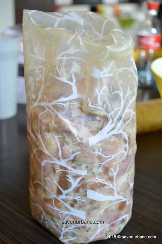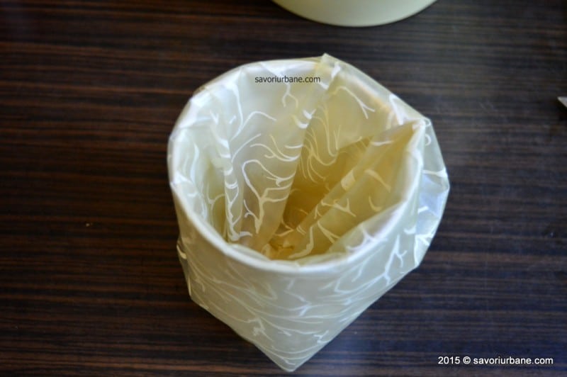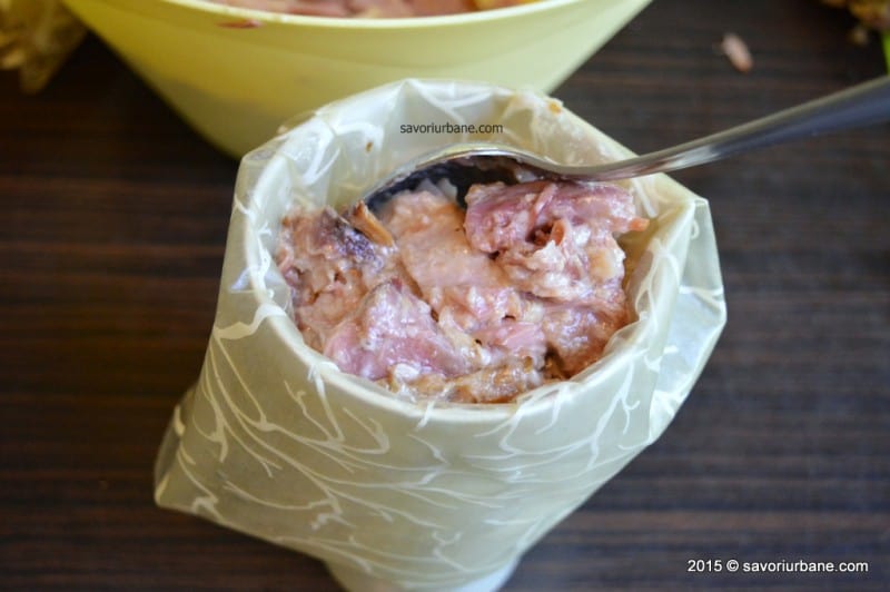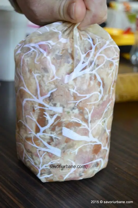 Se umple cu intreaga compozitie si se loveste de masa, se preseaza pentru a iesi aerul. In final se strange in partea de sus si se leaga bine.
