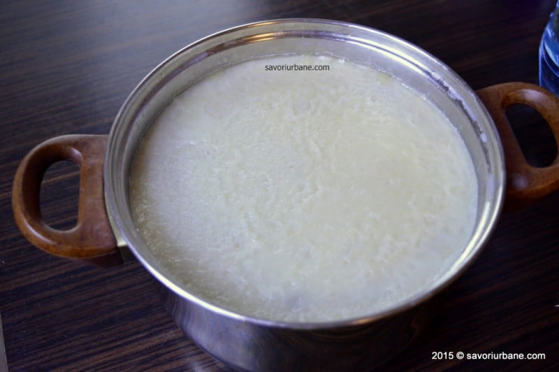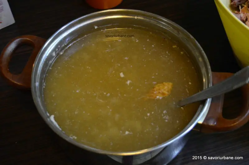 Dupa ce apa in care a fiert s-a racit, se scoate grasimea cu ajutorul unei spatule. Lichidul ramas este gelificat, gros si aromat.