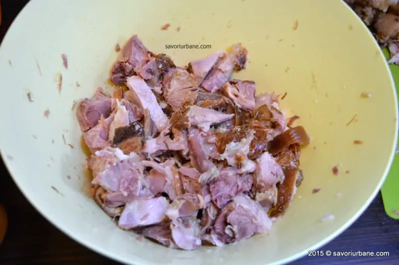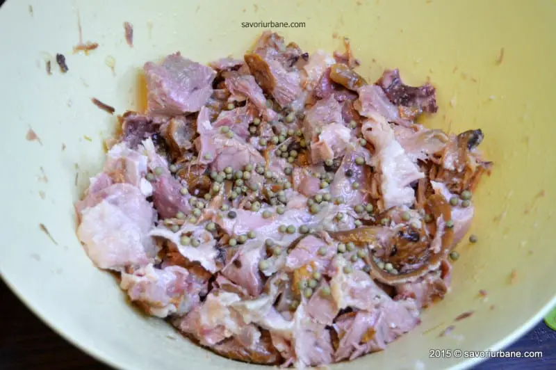 Se scoate ciolanul de pe os pana e caldut si se taie cubulete, mai mari si mai mici. Soricul de la ciolan se taie si el fasiute. Se pune totul intr-un bol. Se taie cubulete marunte si resturile de sunca si se amesteca bine. Cu ajutorul unui polonic se adauga treptat cate un pic din apa in care a fiert (in total circa 200-250 ml) si se amesteca cu mana. In final se adauga si piperul verde. Compozitia se mai amesteca un pic.